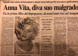 Non si sentiva bella, Anna Vita. Eppure, per il suo fascino, veniva chiamata “La Greta Garbo dei poveri” o “La malattia degli italiani” e aveva ammaliato anche importanti attori. Ed aveva carattere, Anna. Nel 1952 Federico Fellini le offrì la parte di protagonista nel film “Lo sceicco bianco” (interpretato poi da Brunella Bono), ma lei non accettò perché la pellicola ironizzava sull’ambiente da cui proveniva, il fotoromanzo, litigò con il regista e ne andò in America dalla sorella, chiudendo definitivamente con lo star system. Dopo 18 anni arrivò ad Anagni dove ha vissuto fino a dicembre 2009, quando se ne è andata dopo un breve periodo di malattia. Aveva 83 anni.