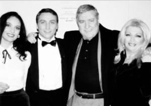 Ho iniziato da piccolo con padre Roberto nell’asilo dove mia madre mi mandava. Padre Roberto era un vero artista e portava i sacramenti in scena. Organizzava piccole recite e io partecipavo. Oltre a recitare, ero un animatore, coinvolgevo gli altri. Avevo 13-14 anni, una mia amica mi parlò di un laboratorio teatrale e ho iniziato così. Non avevo mai pensato di mettere a frutto il mio talento, anche se da piccolo rimanevo incantato davanti alla televisione e in particolare quando vedevo il mago Silvan e Corrado mi immaginavo al posto loro, desideravo fare televisione. La cosa curiosa è che entrambi li ricordo con lo smoking e al mio debutto in televisione ho indossato proprio lo smoking (nelle foto sotto con Amii Stewart, Mario Merola e Gloriana). Ho lavorato per un decennio a Canale 21, una tv privata di Napoli, dove sono stato assunto come attore per la trasmissione “Napoli in parole e in musica” e la presentavo con la cantante Gloriana. Già facevo teatro, l’ho fatto per molto tempo. E quando ho iniziato a farlo mi si è aperto un mondo.